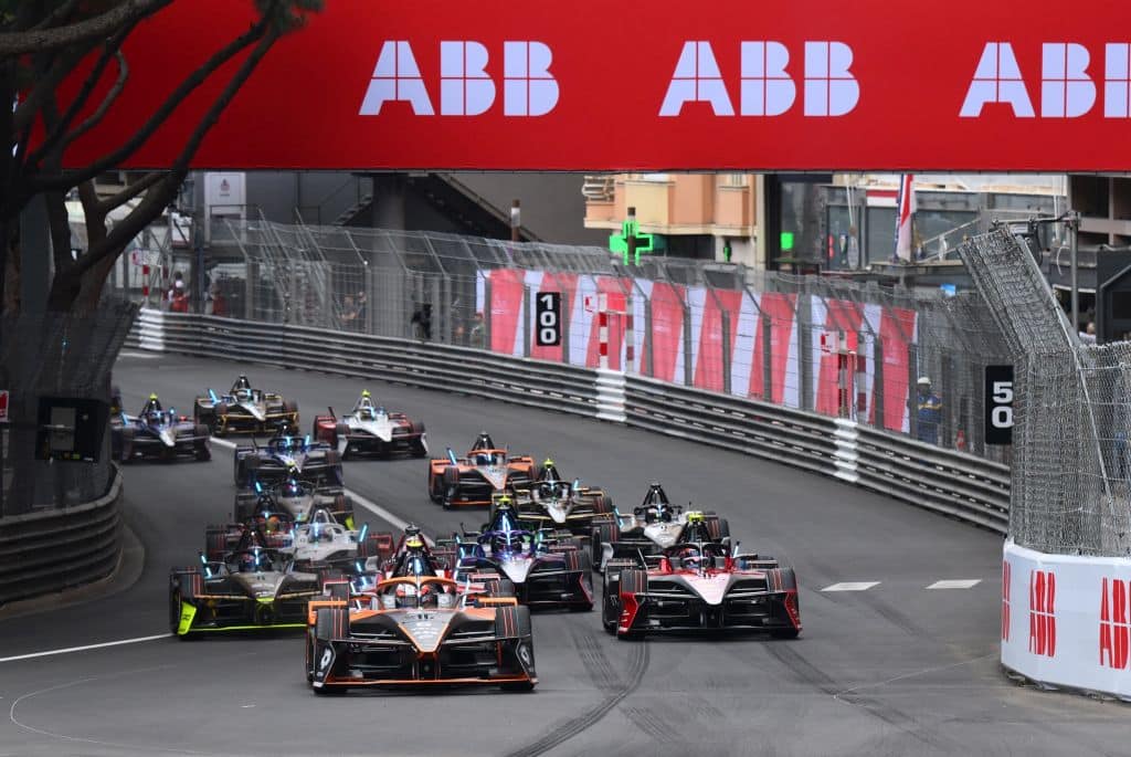 MONTE-CARLO, MONACO - MAY 03: Taylor Barnard of Great Britain driving the (5) NEOM McLaren Formula E Team Nissan e-4ORCE 05 leads the field into turn one at the start during the Monaco E-Prix, Round 6 of the 2025 FIA Formula E World Championship at Circuit de Monaco on May 03, 2025 in Monte-Carlo, Monaco. (Photo by Simon Galloway/LAT Images for Formula E)